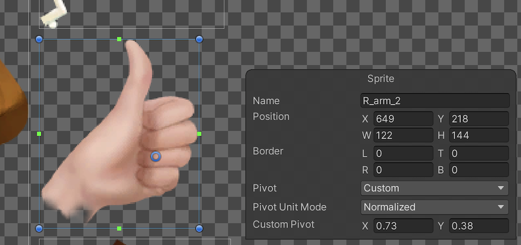 In this example, the two swapped Sprites are aligned by changing the __Pivot__ property from __Center__ to __Custom Position__, and inputting the Custom Pivot position that aligns the `thumbs up` Sprite with the ``open hand`` Sprite.