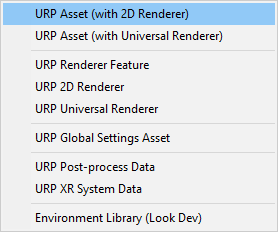 2. Create a new **Pipeline Asset** and **Renderer Asset** by going to the **Assets** menu and selecting **Create > Rendering > URP Asset (with 2D Renderer)**.