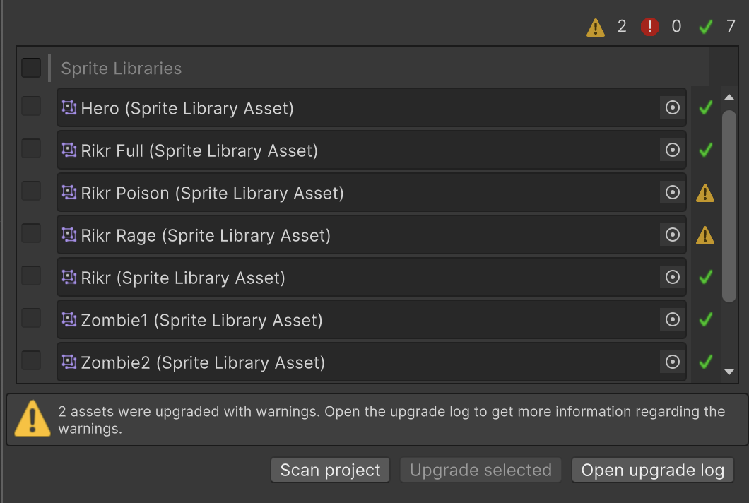 Clear any Sprite Library Assets which you do not want to upgrade.