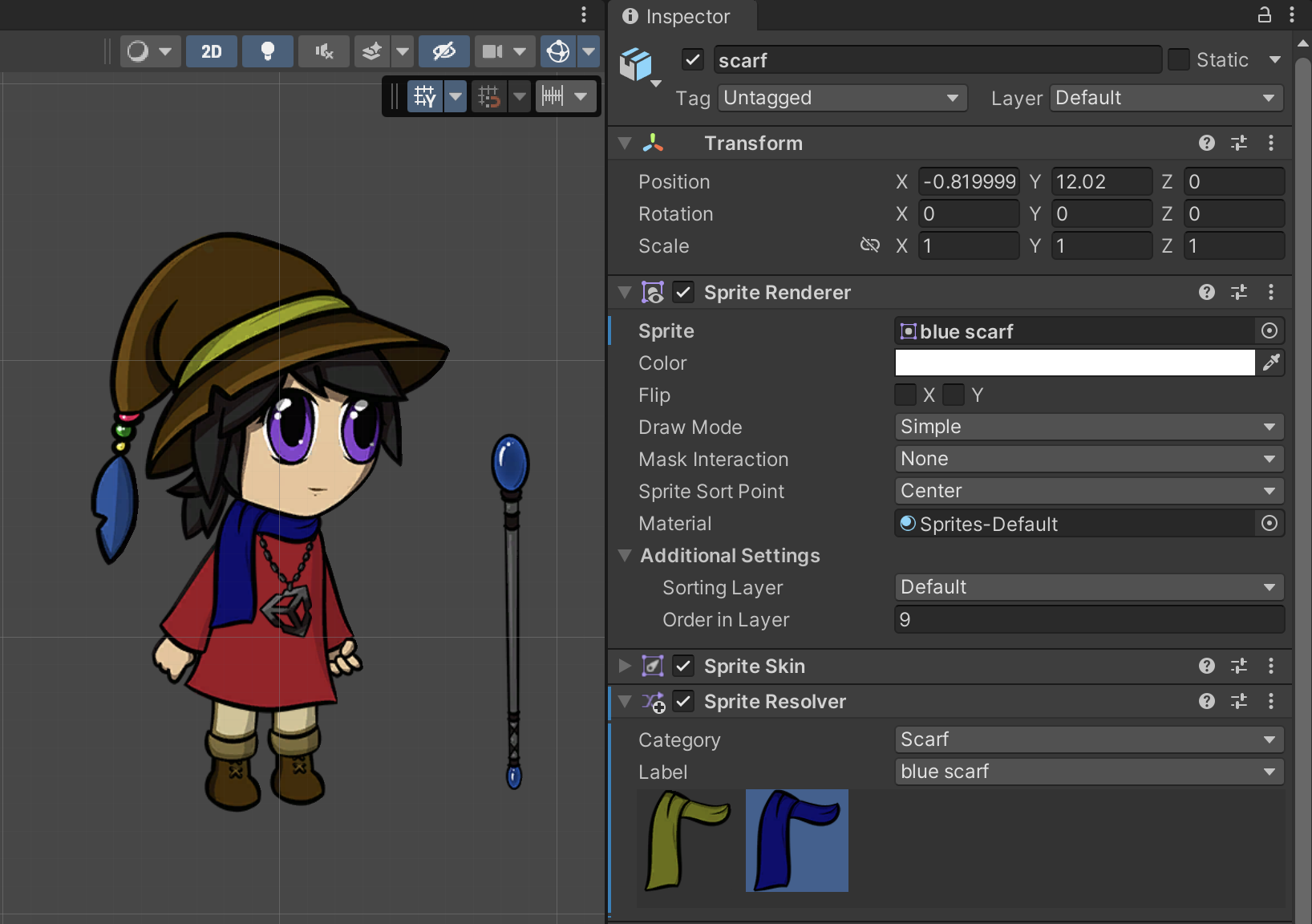 ScarfGameObject. The Sprite Resolver‘s visual selector displays the two Sprites available in theScarfCategory.