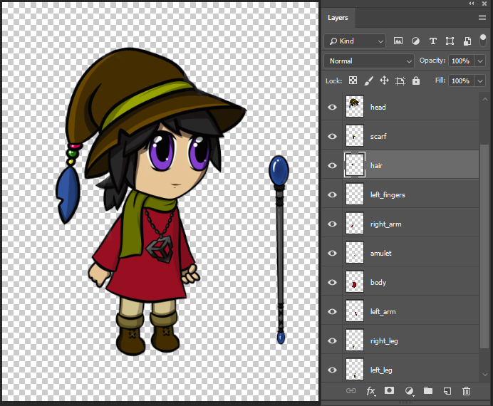 The following is a general workflow for importing a multilayered and multipart character into Unity for 2D animation with the PSD Importer. For a more detailed specific example, see Rigging a character imported with the PSD Importer: