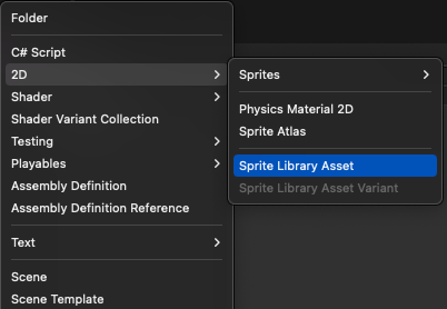 To create a Sprite Library Asset, go to Assets > Create > 2D > Sprite Library Asset.