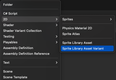 After creating a Sprite Library Asset, select it in the Project window, then go to Assets > Create > 2D > Sprite Library Asset Variant to create a Variant asset that references it.