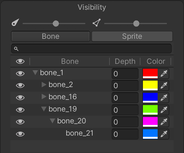 Select the Bone tab to view the list of bones in the character Prefab. The list reflects the hierarchy of bones you created with the Bone tools. You can reparent and reorder bones directly from the bone tab by dragging selected bones up and down the list. Toggle the visibility of each bone by selecting the