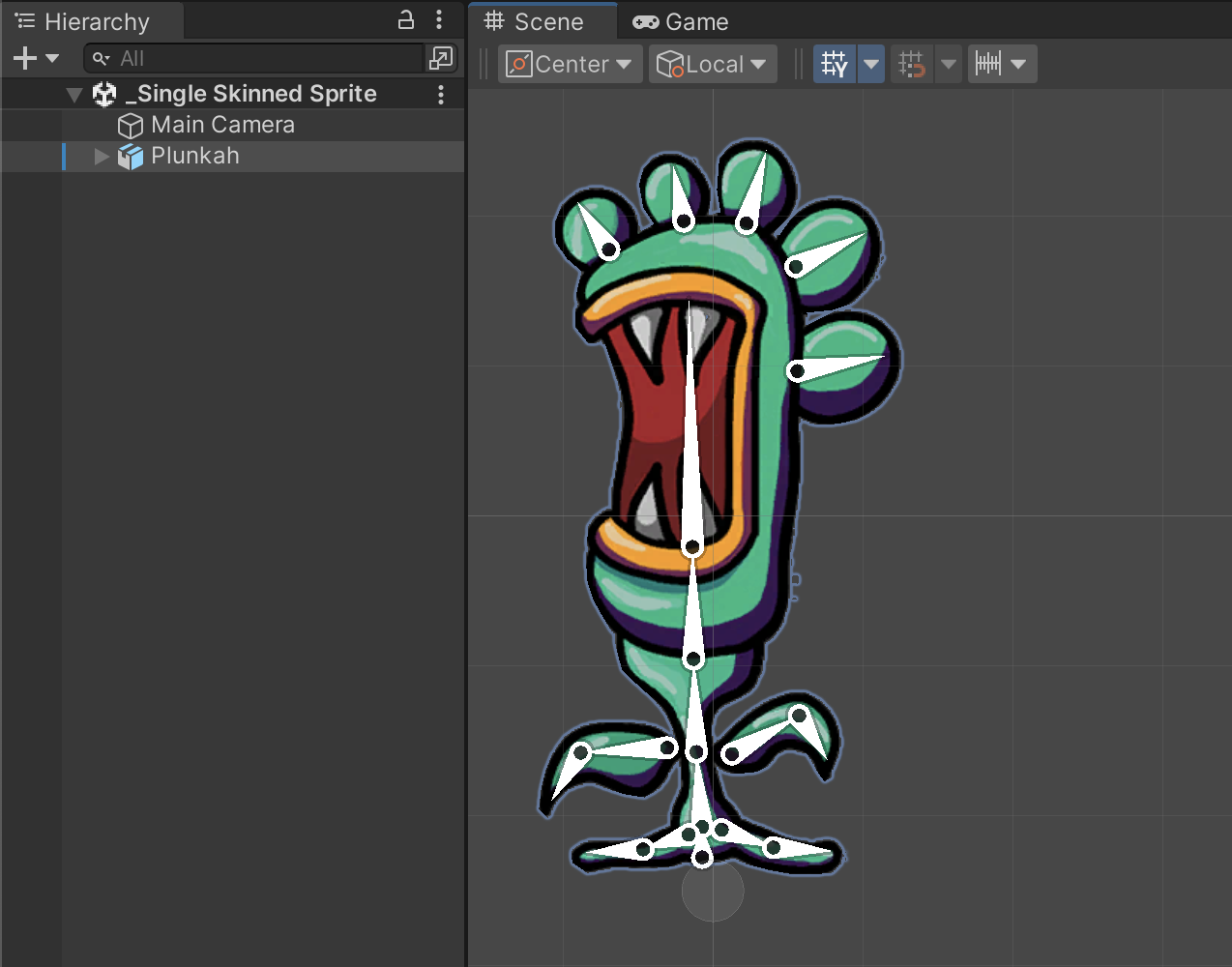 Open the Asset Assets/Samples/2D Animation/[X.Y.Z]/Samples/2 Single Skinned Sprite/Sprites/Plunkah.psd in the Skinning Editor module to examine how the Sprite is rigged.