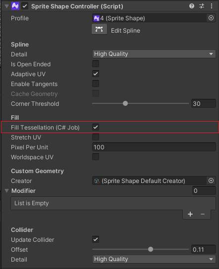 The Fill Tessellation (C# Job) option in the Sprite Shape Controller Inspector window