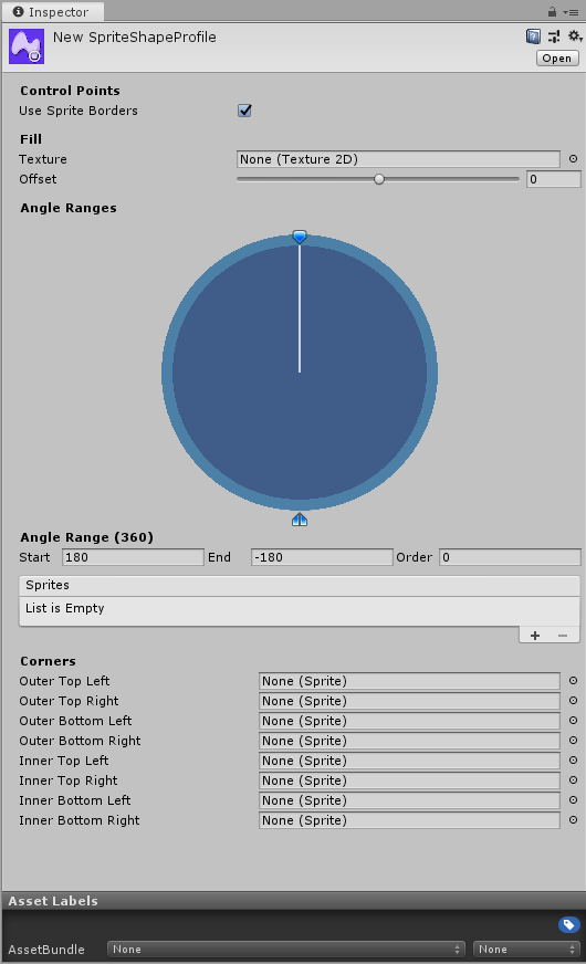 The Sprite Shape Profile contains the settings that determine which Sprites that appear on a Sprite Shape at specific Angle Ranges, as well as other display settings. You can use the same Profile for multiple Sprite Shapes in a Scene.