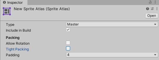 In addition, if the Sprites used for the Sprite Shape are part of a Sprite Atlas, disable both Allow Rotation and Tight Packing options under the Sprite Atlas’ properties so that the Sprites can be used by the Sprite Shape.
