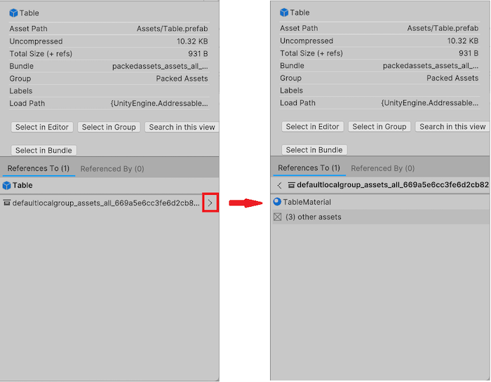Select the arrow next to an Asset or AssetBundle in the References panel to cycle through the dependencies of the top level asset. For example, in the image above, Table has a reference to the bundle defaultlocalgroup_assets_all. Selecting the arrow shows that the asset that generates this dependency is TableMaterial, and that the defaultlocalgroup_assets_all bundle also contains three other assets that aren't dependencies of Table.