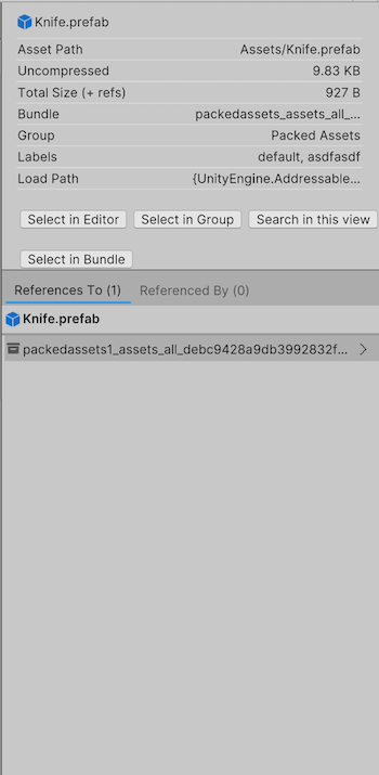- Summary panel: Displays information about an Asset or AssetBundle, such as its file size, its group, and any labels associated with it. Additionally, the summary panel has buttons that you can use to navigate to various places within both the Build Report and the Editor, depending on whether you select an Asset or an AssetBundle.