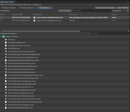 Unity connects your project to your version control Cloud repository; version control automatically creates an ignore file in the workspace for Unity projects so it doesn't track files that shouldn't be part of the repository. It also creates a standard automatic checkin during the initial setup. So now you're all set to start using version control!