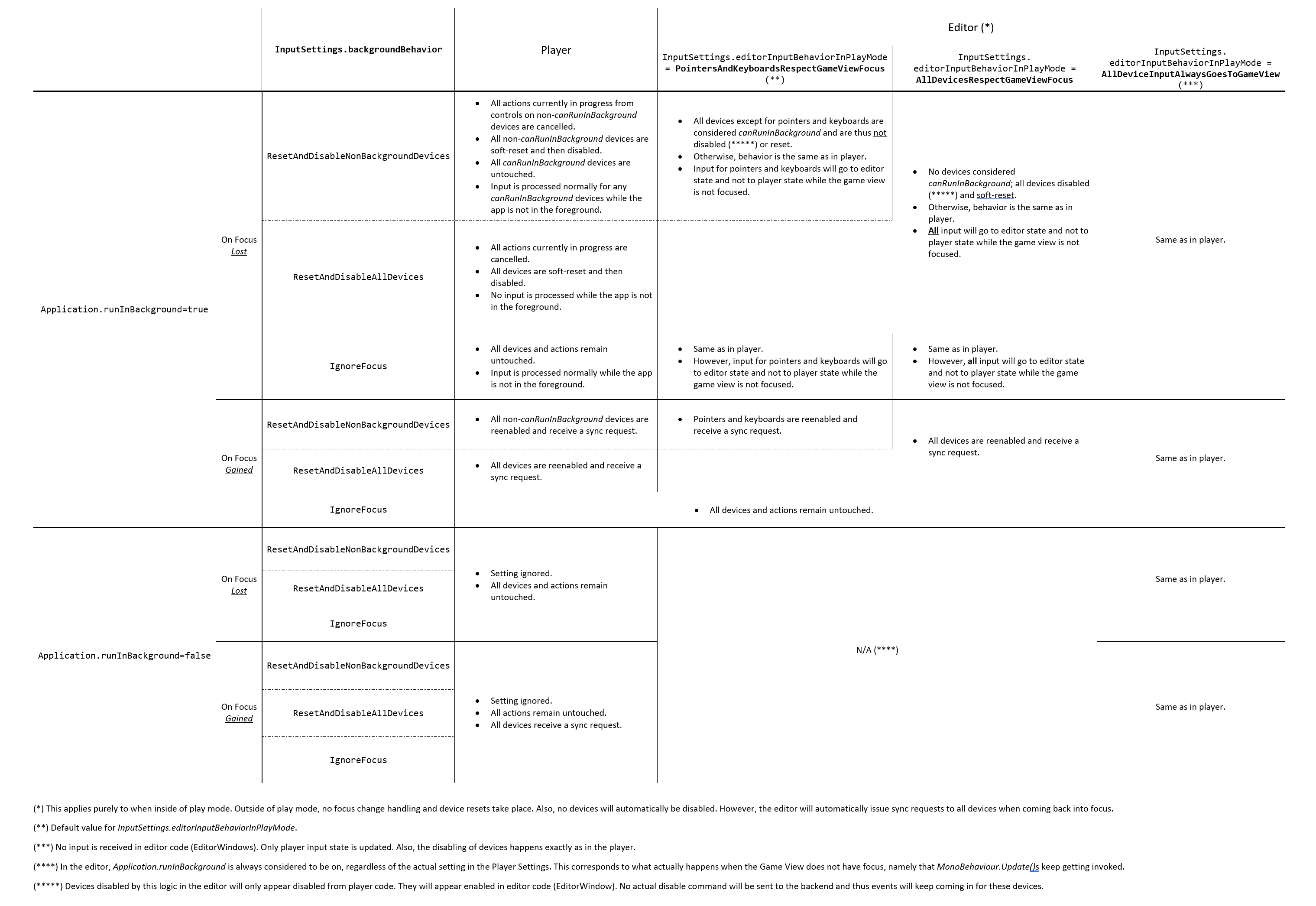 InputSettings.backgroundBehaviorandInputSettings.editorInputBehaviorInPlayMode. The table below shows a detailed breakdown of how input behaviors vary based on these two settings and in relation to theRun In Backgroundplayer setting in Unity.