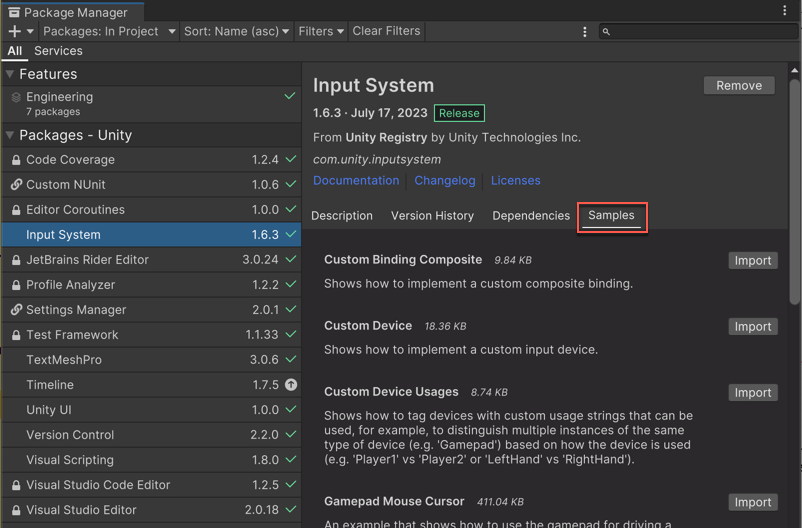 The Input System package comes with a number of samples. You can install these directly from the Package Manager window in Unity (Window > Package Manager). To see the list of samples, select the Input System package in the Package Manager window and click the Samples tab. Then click Import next to any sample name to import it into the current Project.