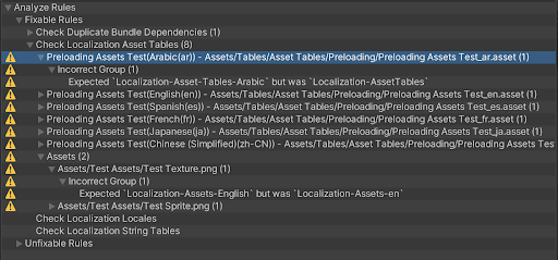 - Check Localization String Tables. This rule checks that the String Tables and their Shared Table Data are contained in the groups defined by Addressable Group Rules, and have the expected Labels and Addresses.