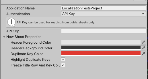 To connect your project to the Google Sheets service, you need to use a Sheets Service Provider asset. This asset includes properties for authentication and for creating a new sheet from inside the Editor. You can create the Sheets Service Provider through the Assets menu. Navigate to Assets > Create > Localization > Google Sheets Service.