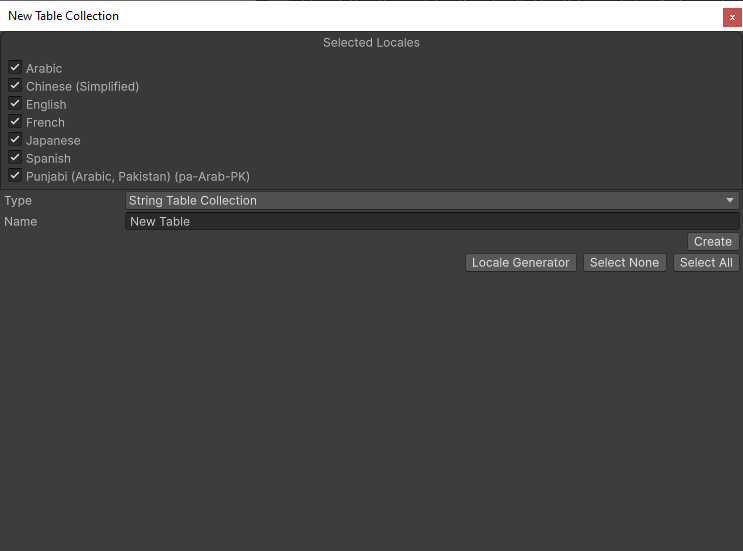 Select the Locales that you want to generate a table for. Unity creates one table per selected Locale. You can add additional Locales after you have created a Table Collection.