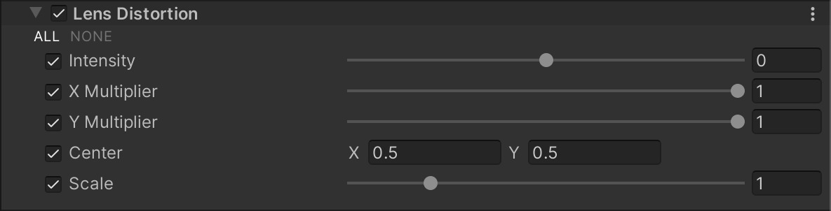 - In the Inspector, navigate to Add Override > Post-processing and click on Lens Distortion. URP now applies Lens Distortion to any Camera this Volume affects.