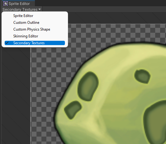 2D Lights can interact with normal map and mask Textures linked to Sprites to create advanced lighting effects, such as normal mapping. Assign these additional Textures to Sprites by using the Sprite Editor’s Secondary Textures module. First select a Sprite, and open the Sprite Editor from its Inspector window. Then select the Secondary Textures module from the drop-down menu at the top left of the editor window.
