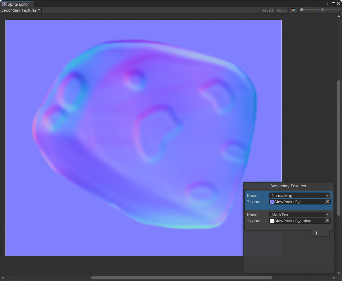 Secondary Textures are sampled with the same UV coordinates as the Texture of the selected Sprite. Align the Secondary Textures with the main Sprite Texture to ensure that additional Texture effects are displayed correctly.