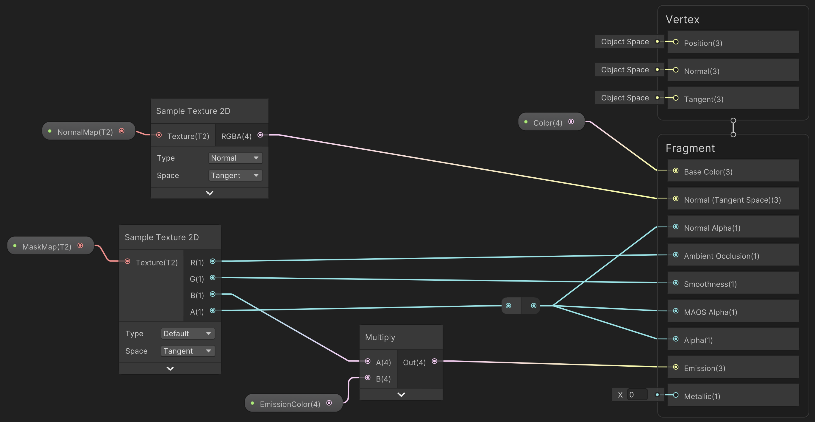 For example, the following Shader Graph uses a normal map and a mask map to drive all properties in the shader. This decal is used for the damaged tarmac effect, and a hardcoded roughness value of 0 suites the use case.