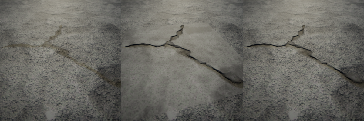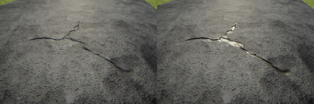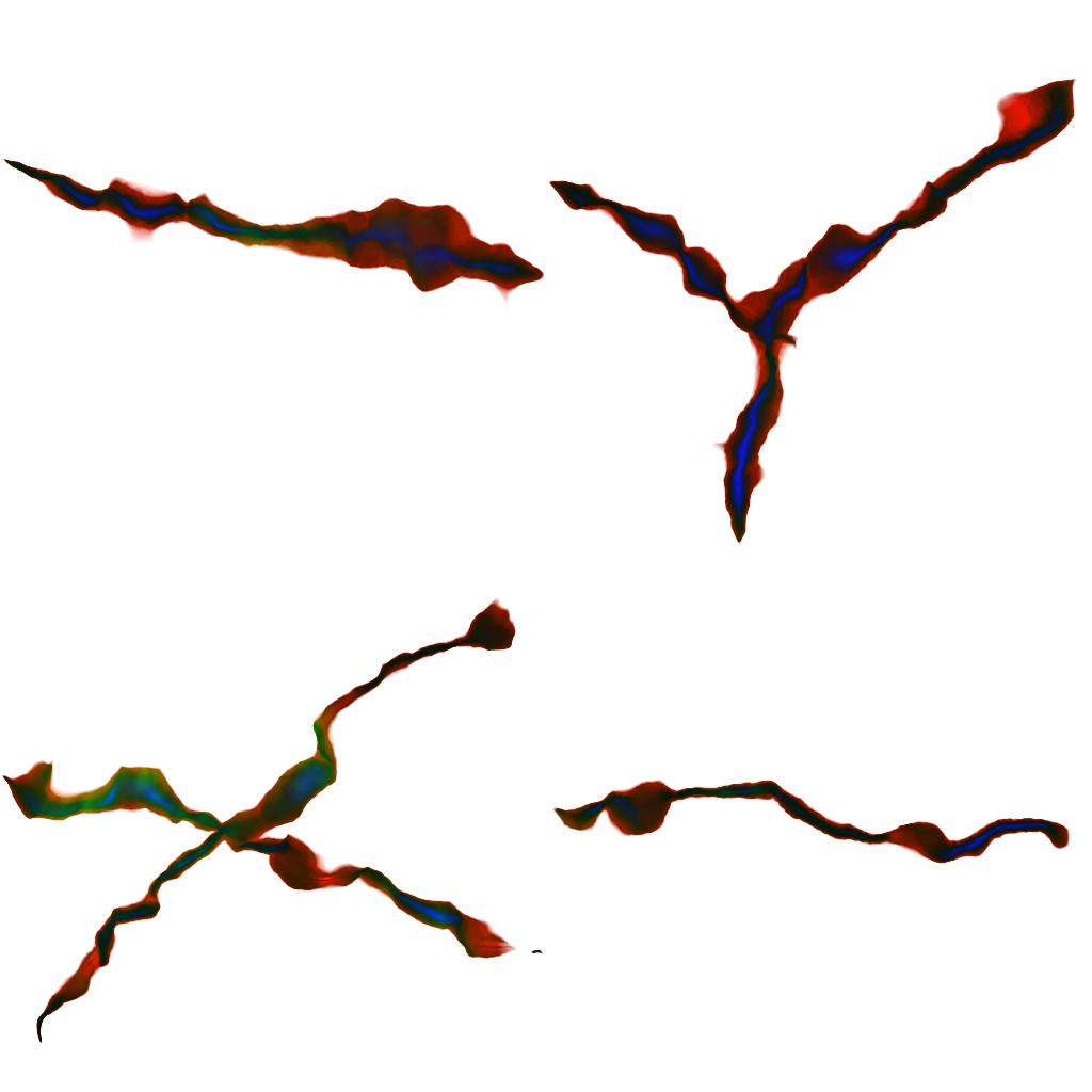 The shader samples the mask and uses the color for setting the Ambient Occlusion values (Red channel), smoothness values (Green channel), Emission intensity values (Blue channel), and alpha values for the entire decal. Decals are often blended using single alpha values for all properties. The following image shows the mask map for the example tarmac cracks: