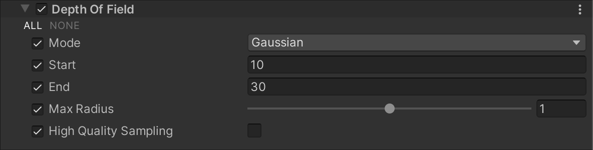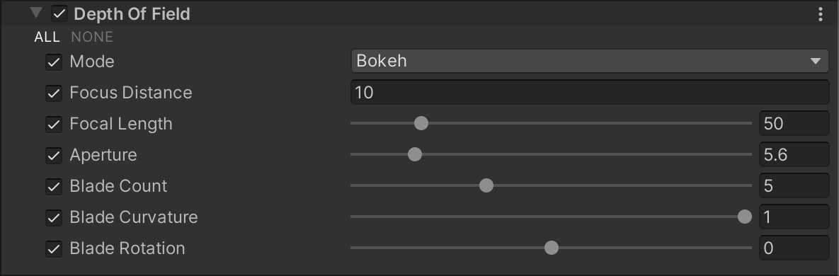 Depth Of Field uses the Volume system, so to enable and modify Depth Of Field properties, you must add a Depth Of Field override to a Volume in your scene. To add Depth Of Field to a Volume: