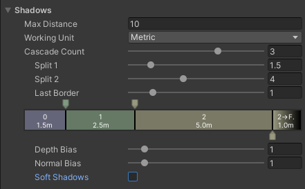 | Working Unit | The unit in which Unity measures the shadow cascade distances. |