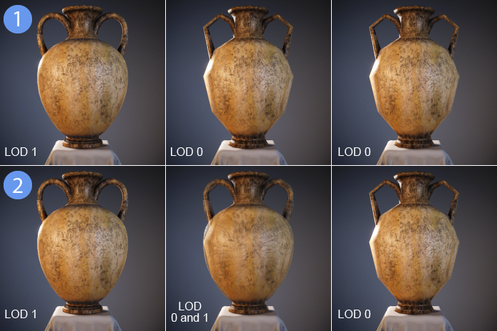 As the Camera moves, Unity shows different LODs to provide a good balance between quality and processing cost. Cross-fading lets you avoid harsh LOD snapping and popping.