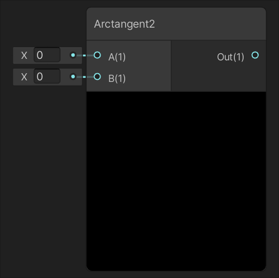 | Returns the arctangent of the value of input In. Each component should be within the range of -Pi/2 to Pi/2. | Returns the arctangent of the values of both input A and input B. |