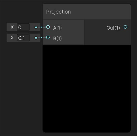 | Returns the result of projecting the value of input A onto a straight line parallel to the value of input B. | Returns the result of the projection of the value of input A onto the plane orthogonal, or perpendicular, to the value of input B. |