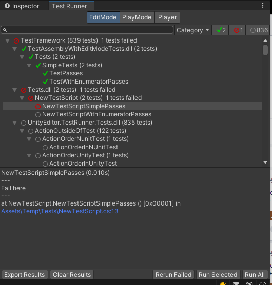 - Added a third tab to the Test Runner window, for running in a player explicitly. This makes it easier to run a subset of tests, as well as retaining the test results from the latest player run.