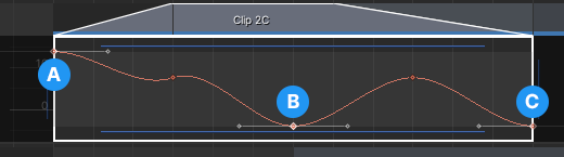 (B) Keyframe with weighted tangents. Its tangent handles are drawn as outlines. In this example, the left and right tangents are set to different lengths.
