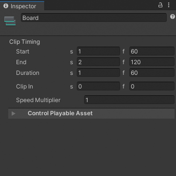 Use the Inspector window to change the playable asset properties of a Control clip. To view the playable asset properties for a Control clip, select a Control clip in the Timeline window and expand Control Playable Asset in the Inspector window.