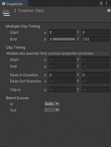 If you select multiple Timeline assets, tracks, clips, or markers, the Inspector window lists the properties that apply to the selection as a group followed by properties common to all selected items.