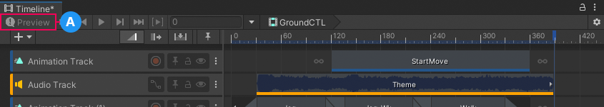 • Timeline preview is disabled when using the Timeline Playback Controls. To preview your Scene, you must use Play Mode.