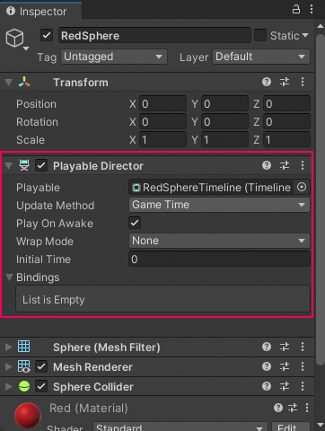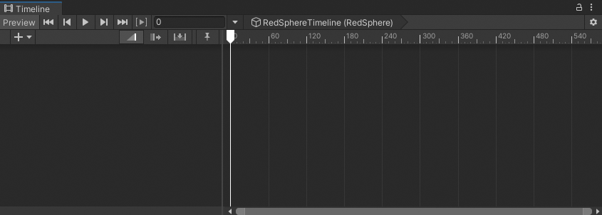 The Timeline window saves a new Timeline asset to the Assets directory of your Project. If you did not change the name and location of the Timeline asset you are creating, the Timeline window creates a name based on the selected GameObject with the Timeline suffix. For example, selecting the GameObject called RedSphere names the Asset RedSphereTimeline.