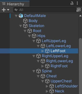 1. In the Scene Hierarchy, navigate and choose LeftFoot in the DefaultMale character hierarchy.