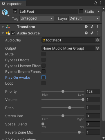 4. In the Audio Source component for LeftFoot, disable Play On Awake so that the Audio Source does not automatically play when switching to Play mode in the Game view.