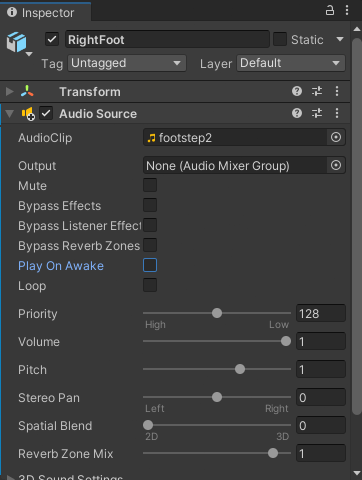 Audio Source for RightFoot with the audio file selected and Play On Awake disabled