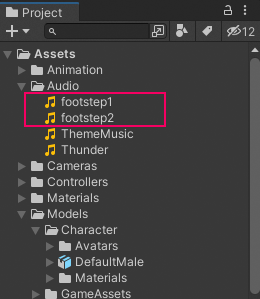 The audio files footsteps1.wav and footsteps2.wav are copied or moved to the Audio folder within the Assets folder