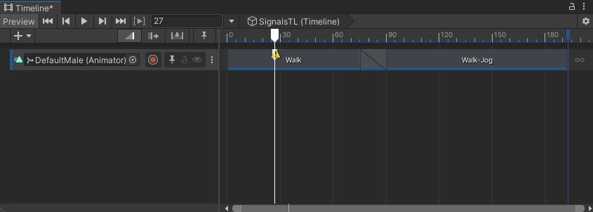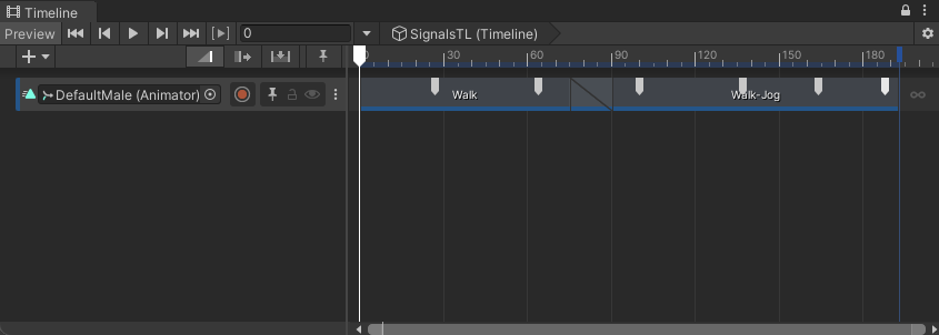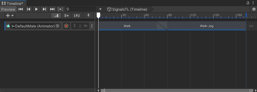 The Timeline instance in this workflow, named SignalsTL, has a single Animation track bound to the DefaultMale model. The Animation track starts with a walk cycle and blends into a walk to jog cycle. The Timeline instance is associated with an empty GameObject named Timeline.