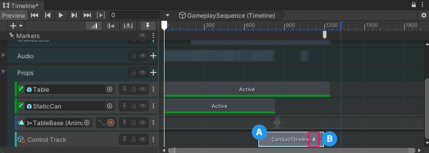 5. Select and drag the CanSubTimeline GameObject into the Control track that you added to the Props Track group.