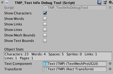 Object Stats Shows statistics about the TextMesh Pro GameObject, such as the number of characters, words, lines, and spaces.