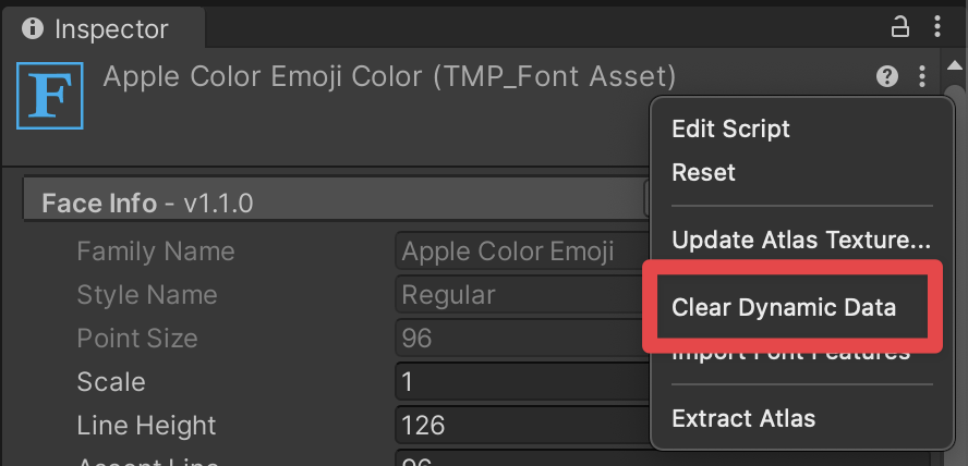 The Clear Dynamic Data context menu option clears the character and glyph tables as well as the font asset's atlas texture which is also resized back to size zero. This option preserves all font feature table data such as Ligatures, Glyph Adjustment, Mark to Base, Mark to Mark, etc.
