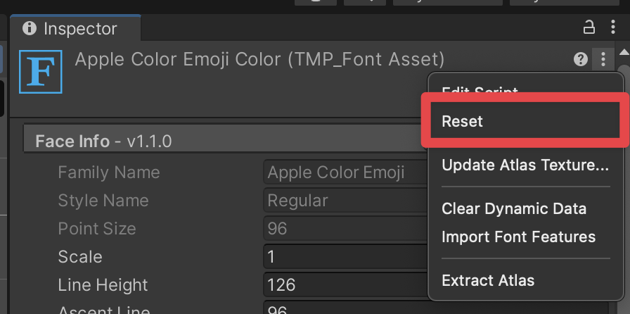 The Reset context menu option clears all tables which includes the Character and Glyph tables along with all font features tables such as the Ligature, Glyph Adjustment, Mark to Base, Mark to Mark tables. This option also clears the font asset's atlas texture and resets it back to size zero.