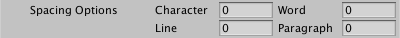 These options control spacing between characters, words, lines and, paragraphs. You can use them to fine-tune the text for individual TextMesh Pro GameObjects, without adjusting their font assets.