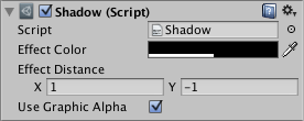 The Shadow component adds a simple outline effect to graphic components such as Text or Image. It must be on the same GameObject as the graphic component.