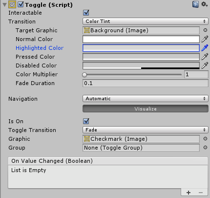 The Toggle has a single event called On Value Changed that responds when the user changes the current value. The new value is passed to the event function as a boolean parameter. Typical use cases for Toggles include: